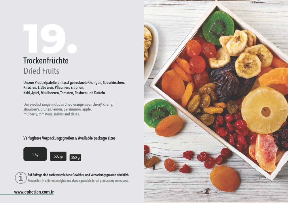 Our wide range of products varies from dried fruits and vegetables to fine canned goods, which are ripened under the Mediterranean sun in the fertile Anatolian soil and preserved with the utmost care in compliance with European standards. For our customers we offer only the best from our fields to their table all year round…